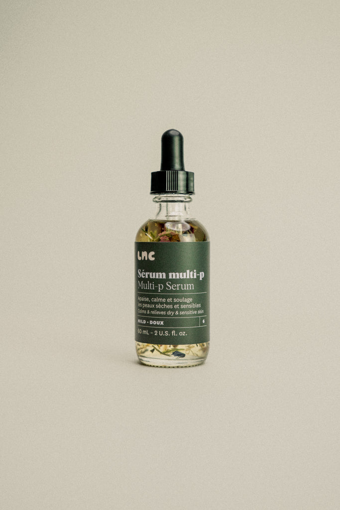 Notre Sérum Multi-P (multi-plantes) est une combinaison d'huiles nourrissantes et de plantes macérées. Ce sérum aide à apaiser, calmer et soulager les peaux sensibles. C'est une superbe option pour les peaux à tendances acnéiques qui ont des rougeurs et des boutons avec inflammation. Il aide aussi à stabiliser la production de sébum et hydrater la peau. Bienfaits du sérum : astringent, purifiant, tonifiant, adoucissant et plus encore. Cette huile remplie de nutriments est recommandée en combinaison avec la Crème Hydra-S.