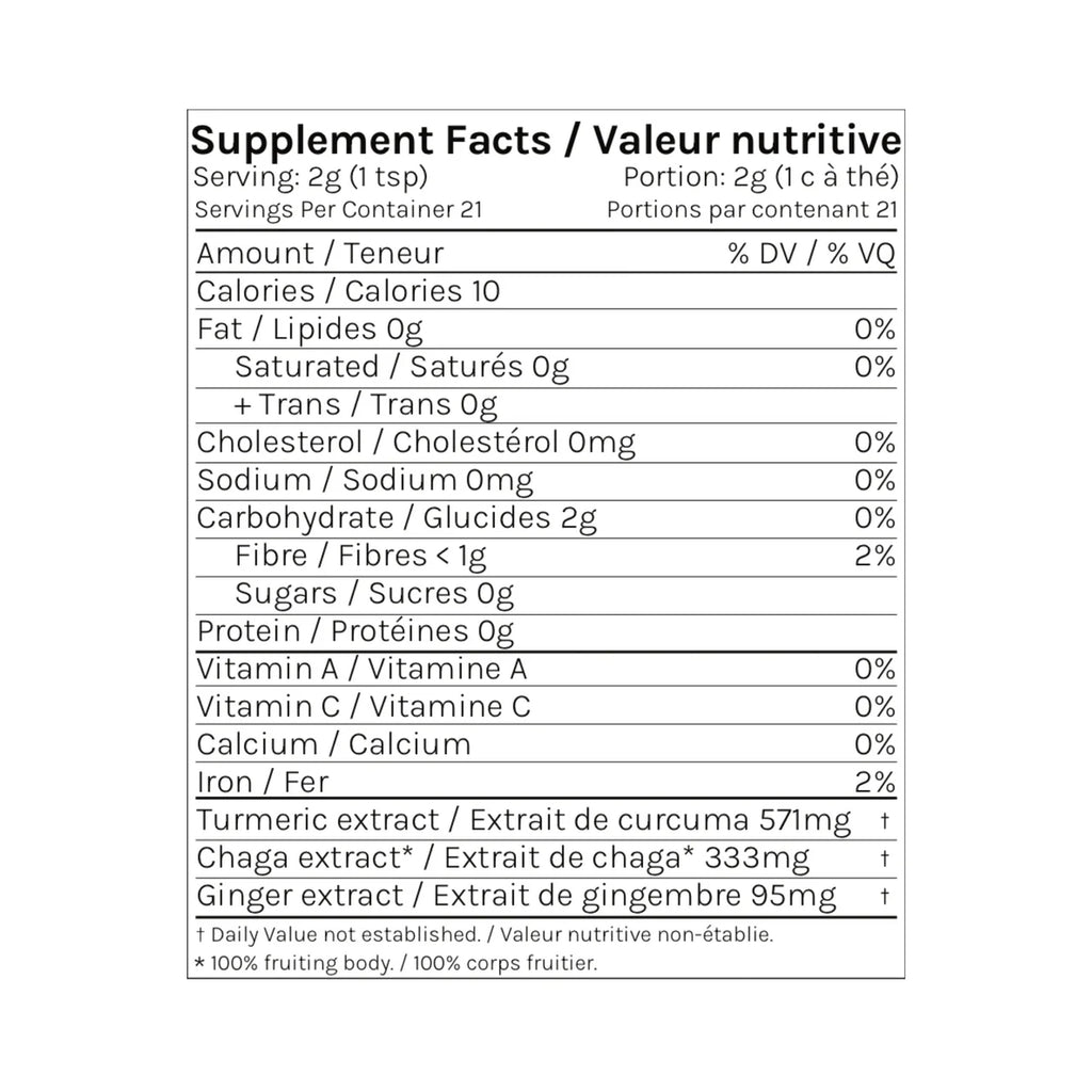 A warming pick-me-up. Caffeine-free adaptogen drink spiced with turmeric, cinnamon, and ginger. Contains black pepper for maximum bioavailability and a tocopherol base to maintain healthy skin.
