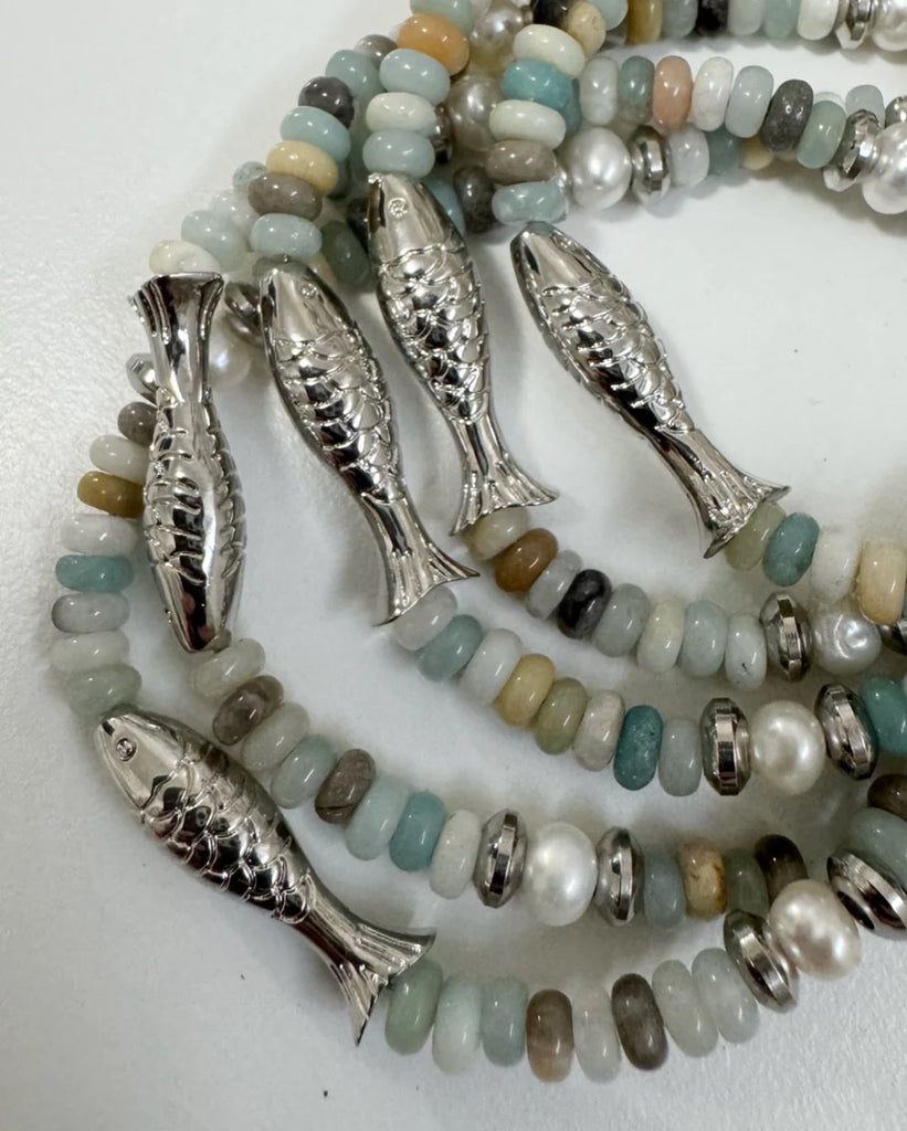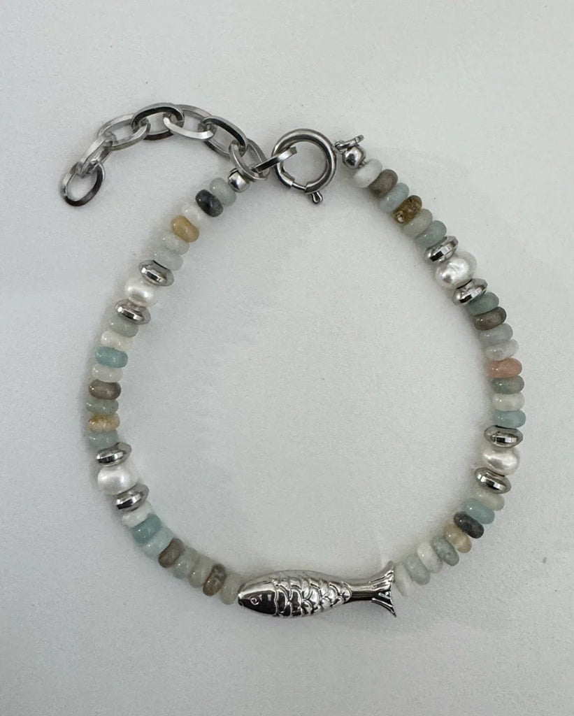 Materials: Bracelet made of freshwater pearls and amazonite semi-precious stones, with gold-filled spacer beads and a stainless steel clasp.