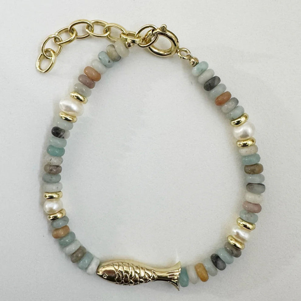 Materials: Bracelet made of freshwater pearls and amazonite semi-precious stones, with spacer beads and gold-filled clasp.