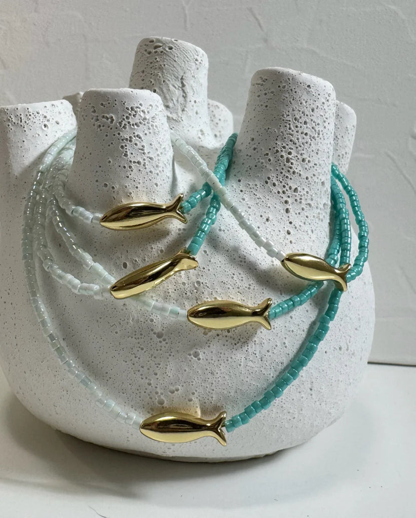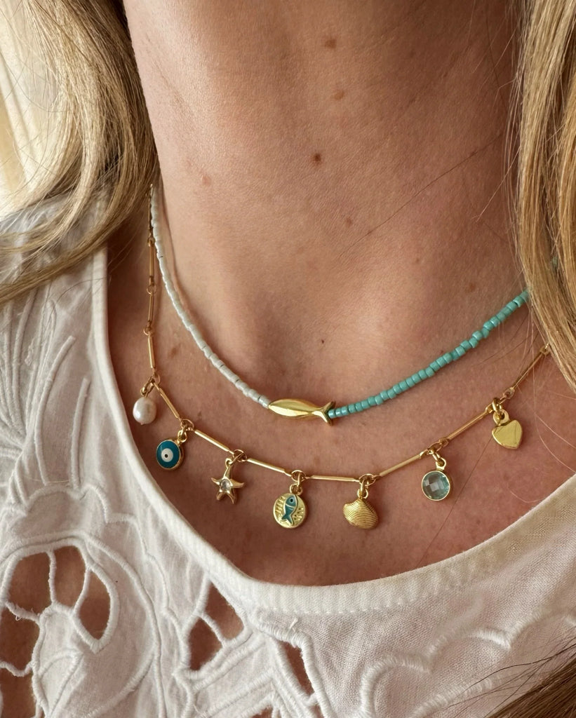 Material: Necklace made of Stellaris beads, decorated with a fish pendant and a gold-filled clasp