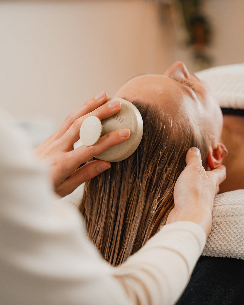 Le soin commence par un massage capillaire à sec, combinant les mains et une brosse démêlante pour activer la circulation sanguine.
